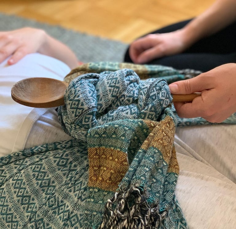Nach der Geburt kann die Arbeit mit dem Rebozo besonders wohltuend sein. Durch sanftes Halten, Wiegen und Lockern werden Bereiche wie Becken, Rücken, Schultern oder Beine behutsam unterstützt.